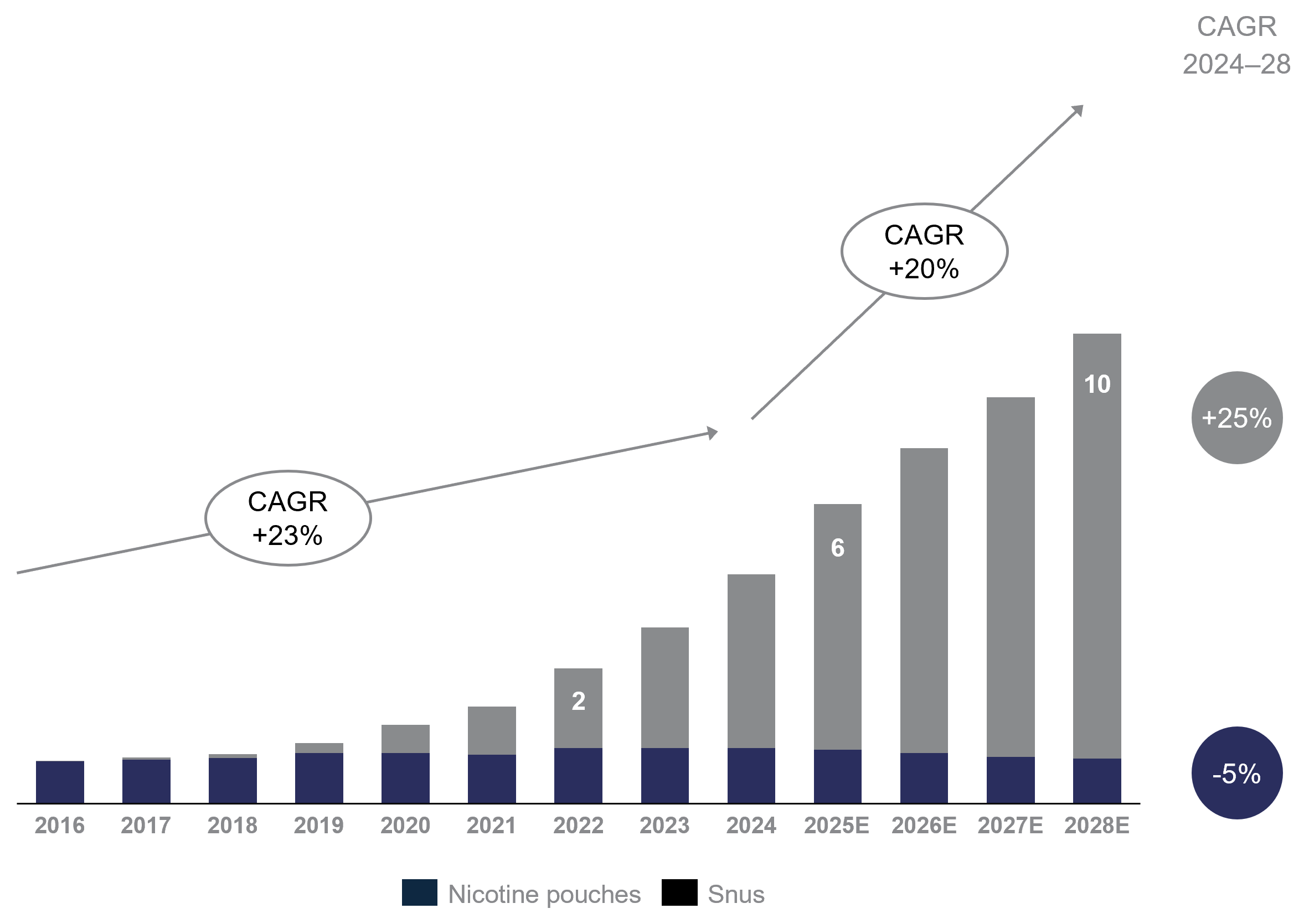 The market for nicotine pouches and snus is currently experiencing a pronounced shift away from combustible tobacco products such as cigarettes to smokeless products such as snus and tobacco-free nicotine pouches as well as a shift from offline- to online sales. The underlying reasons for a shift away from traditional smoking tobacco products are driven by an increasing demand for products which are considered as safer alternatives to cigarettes in combination with legislation that favours smokeless tobacco. This shift has resulted in all global tobacco manufacturers introducing reduced-risk product strategies where nicotine pouches are a highlighted strategic area of focus.